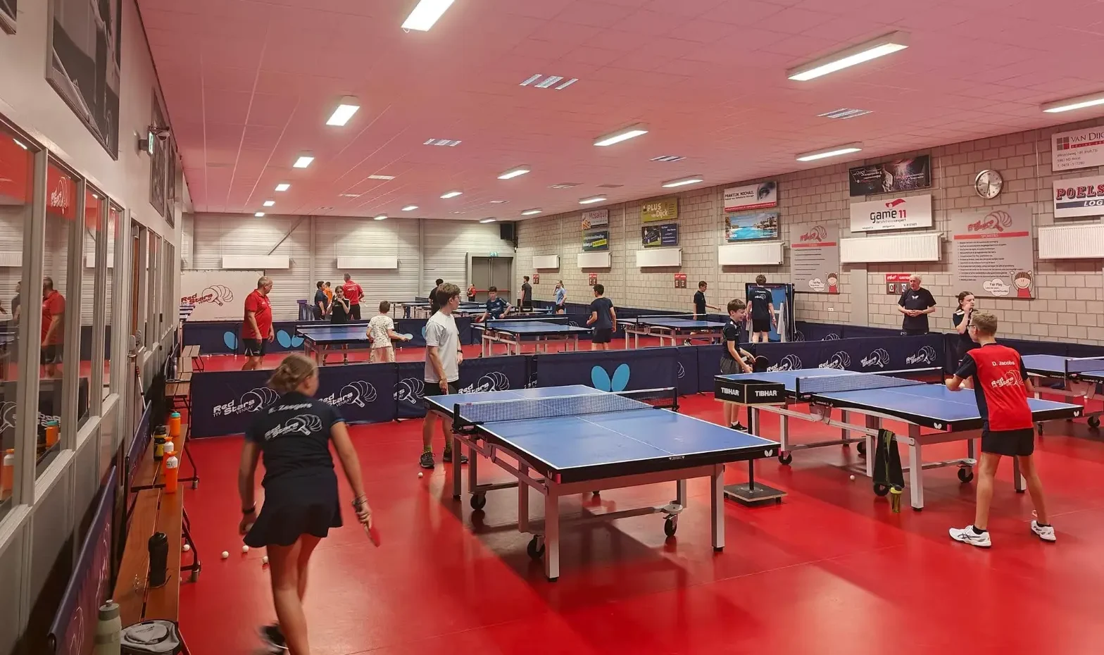 Onze zaal is ingericht met professionele tafels en vloer, voldoende ruimte, goed licht en een fijne sfeer. Hier zijn alle trainingen, de beste wedstrijden en een trouw publiek. Naast de speelzaal hebben we ook een gezellige kantine die goed gebruikt wordt!